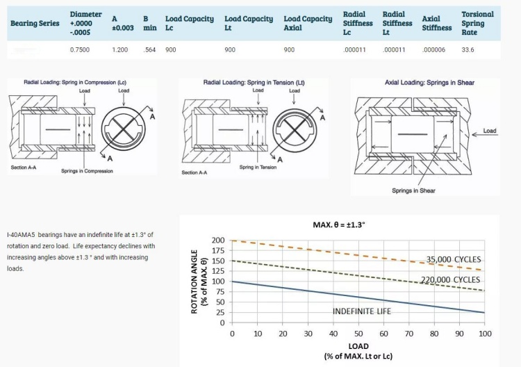 C-Flex 軸承或樞軸是圓柱形有限旋轉(zhuǎn)軸承,具有較高的相對徑向和軸向剛度,可提供低、中或高扭轉(zhuǎn)彈簧剛度。它通??捎糜?+/-30 的**偏轉(zhuǎn)角,但可根據(jù)要求提供各種配置。扭轉(zhuǎn)剛度范圍從 0.0003 Lb-In/度到 7.8023 Lb-In/度。它可以簡單地用作振蕩單元或極其敏感的關(guān)鍵元件。